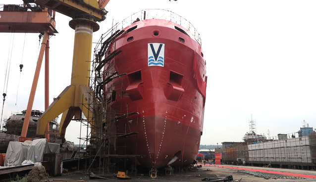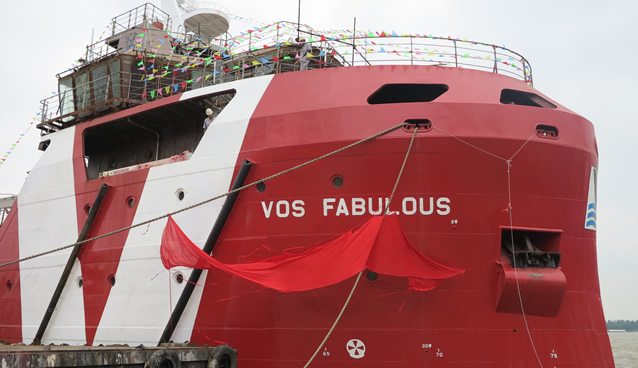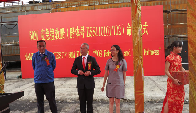 近日,南京東嘉船舶舉行了兩艘50米應(yīng)急搜救船的命名儀式,這也是在北海油田的應(yīng)急搜救船首次采用亞洲設(shè)計公司設(shè)計,并由中國船廠制造。以往此類船型一般是采用歐洲設(shè)計,歐洲制造,這標(biāo)志著國內(nèi)船廠已經(jīng)有能力承建海工高標(biāo)準(zhǔn)的特種船型。 船東方Vroon公司的總經(jīng)理,商務(wù)總監(jiān)及前董事長出席,ABS也派代表參加了儀式。