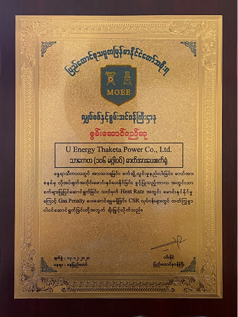 2020年12月13日緬甸電力與能源部在內(nèi)比都舉行年會,聯(lián)合能源達克鞳電力有限公司(U Energy Thaketa Power Co., Ltd)榮獲年度“優(yōu)秀電廠”表彰。